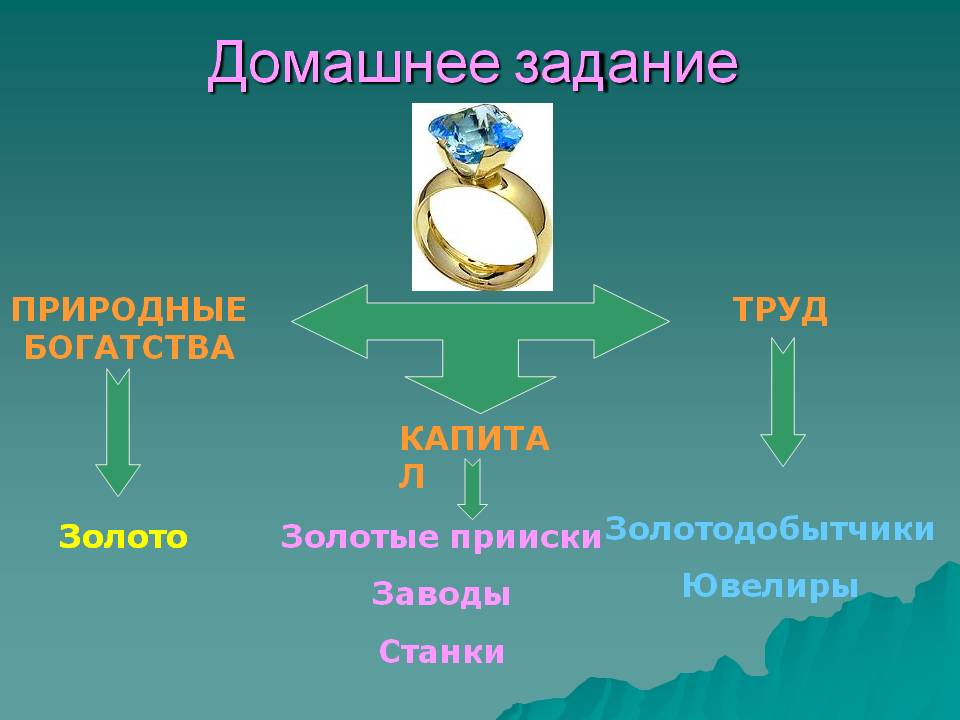 Домашнее задание. Природные богатства. Труд. Капитал. Золотодобытчики Ювелиры. Золото. Золотые прииски Заводы Станки. Слайд 10 из презентации «Экономика».